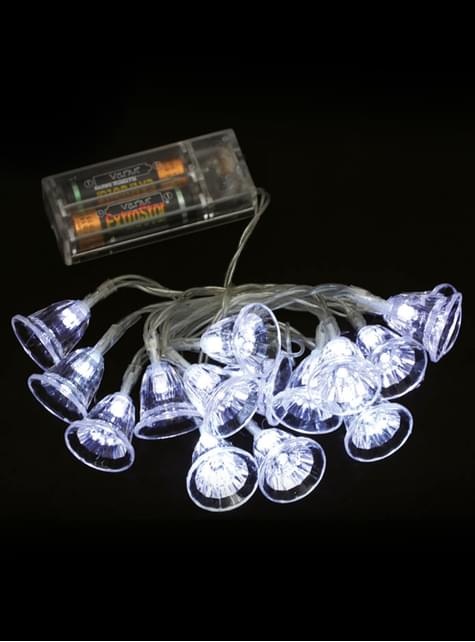 含む: 冷たい白色のベル型ライトが10球ついている全長150cmのイルミネーション・ライト。非点滅。単三電池2本使用。